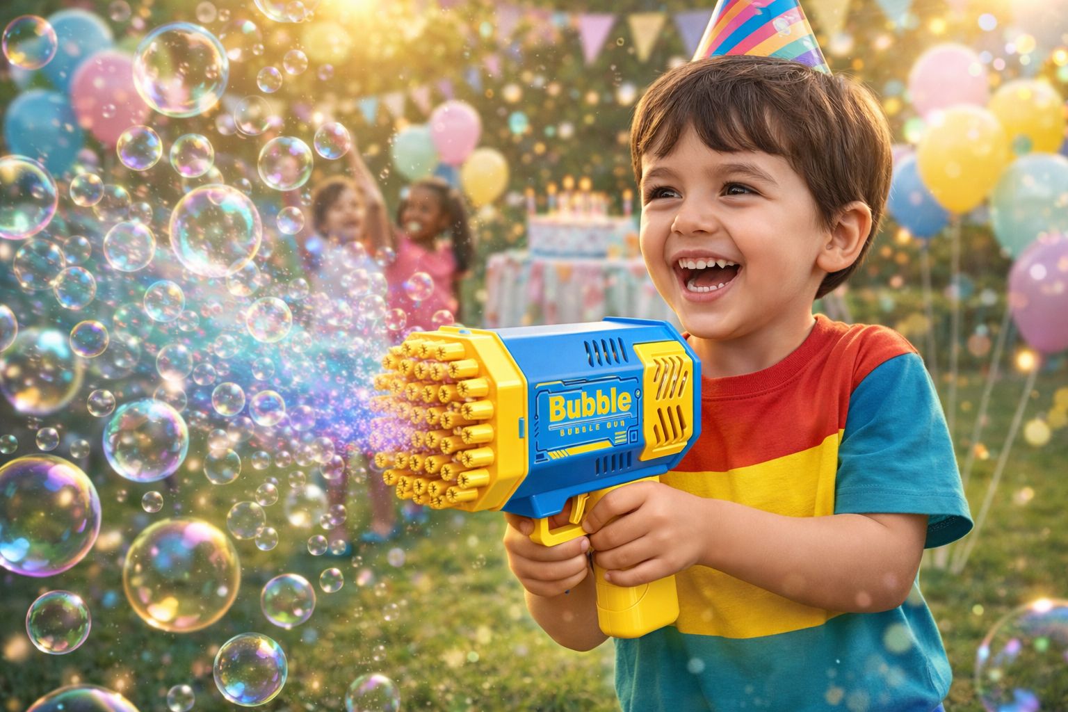 [IMAGEM 1 – GIF: Criança segurando a pistola de bolhas disparando centenas de bolhas simultaneamente em festa]
