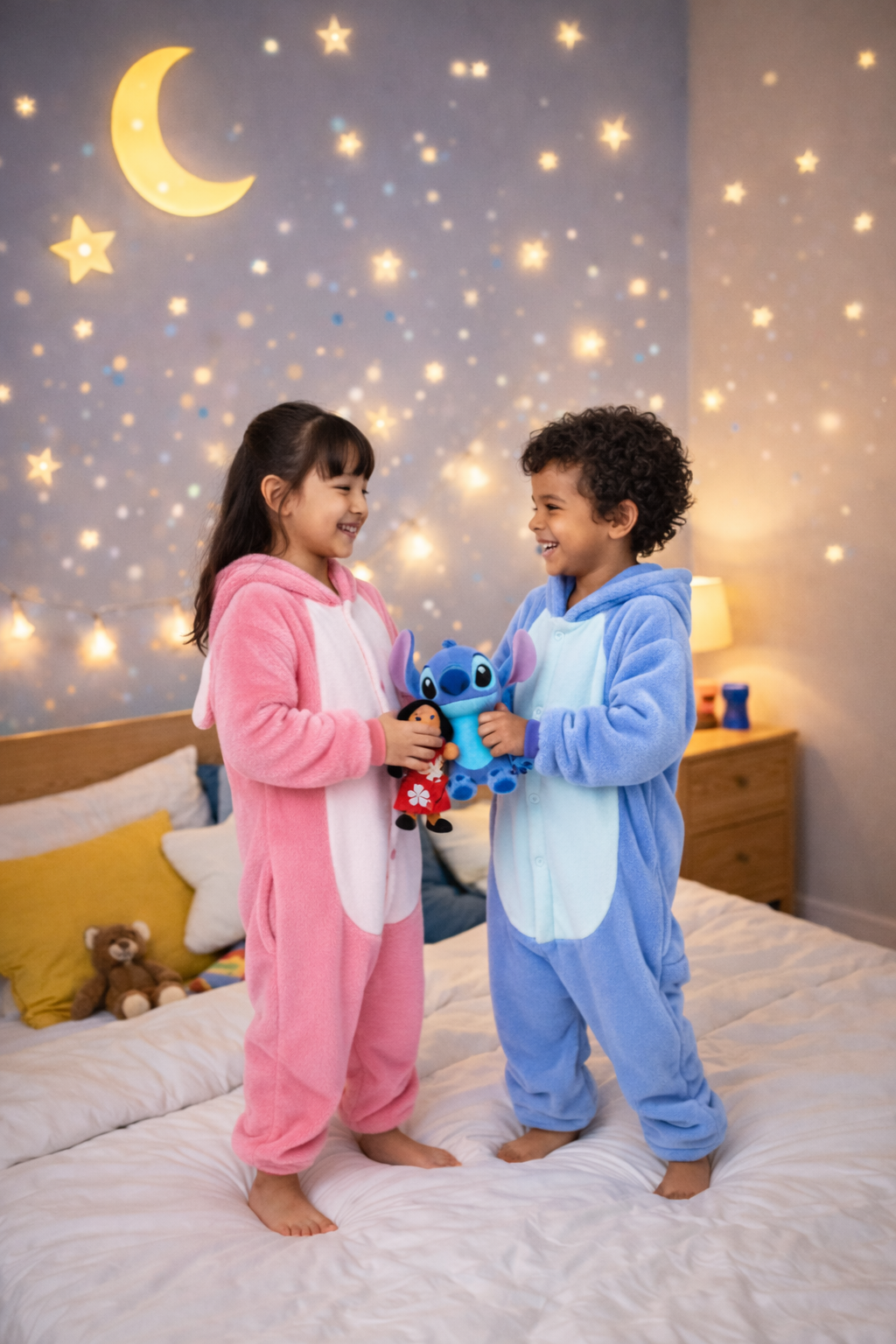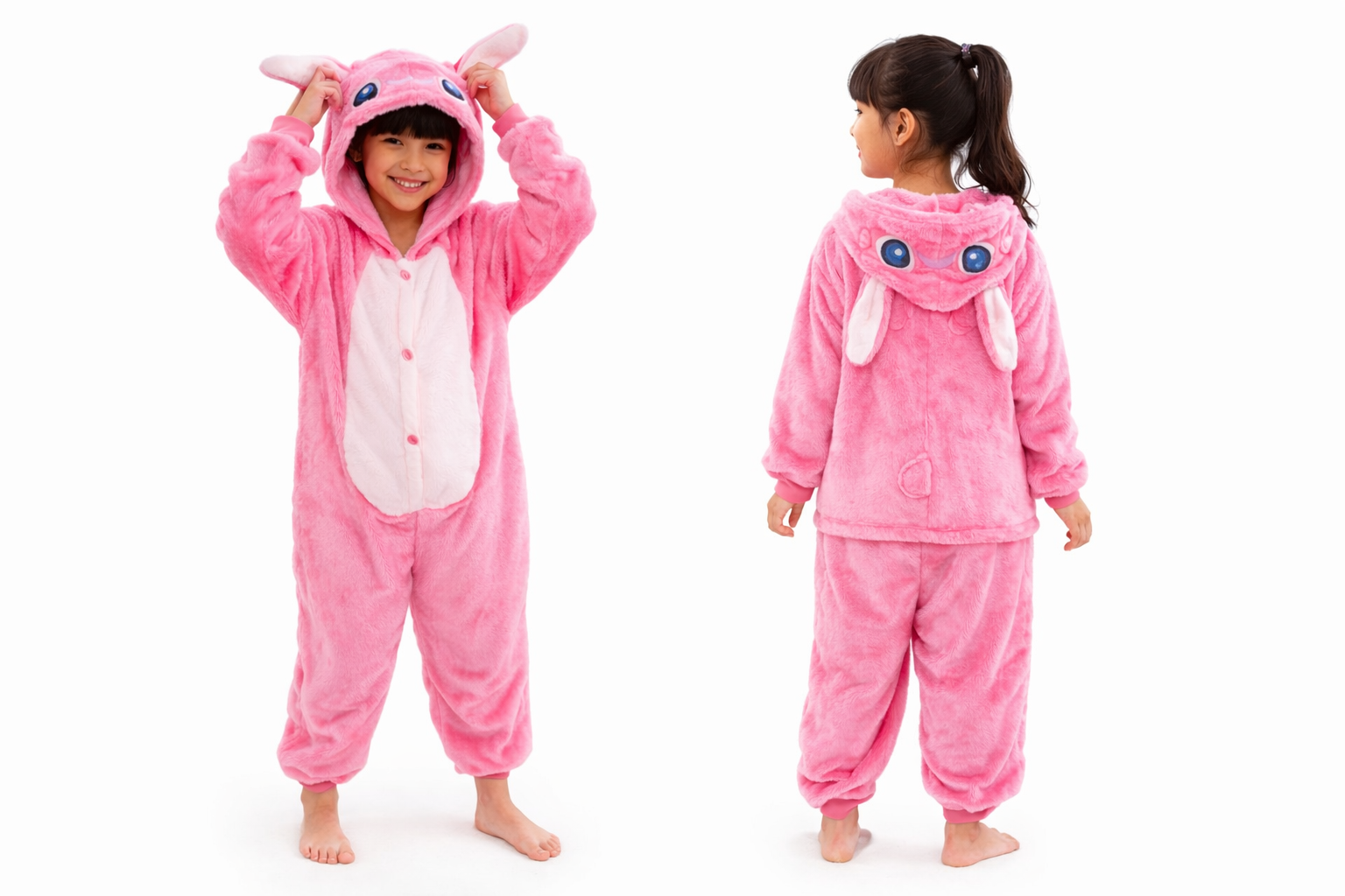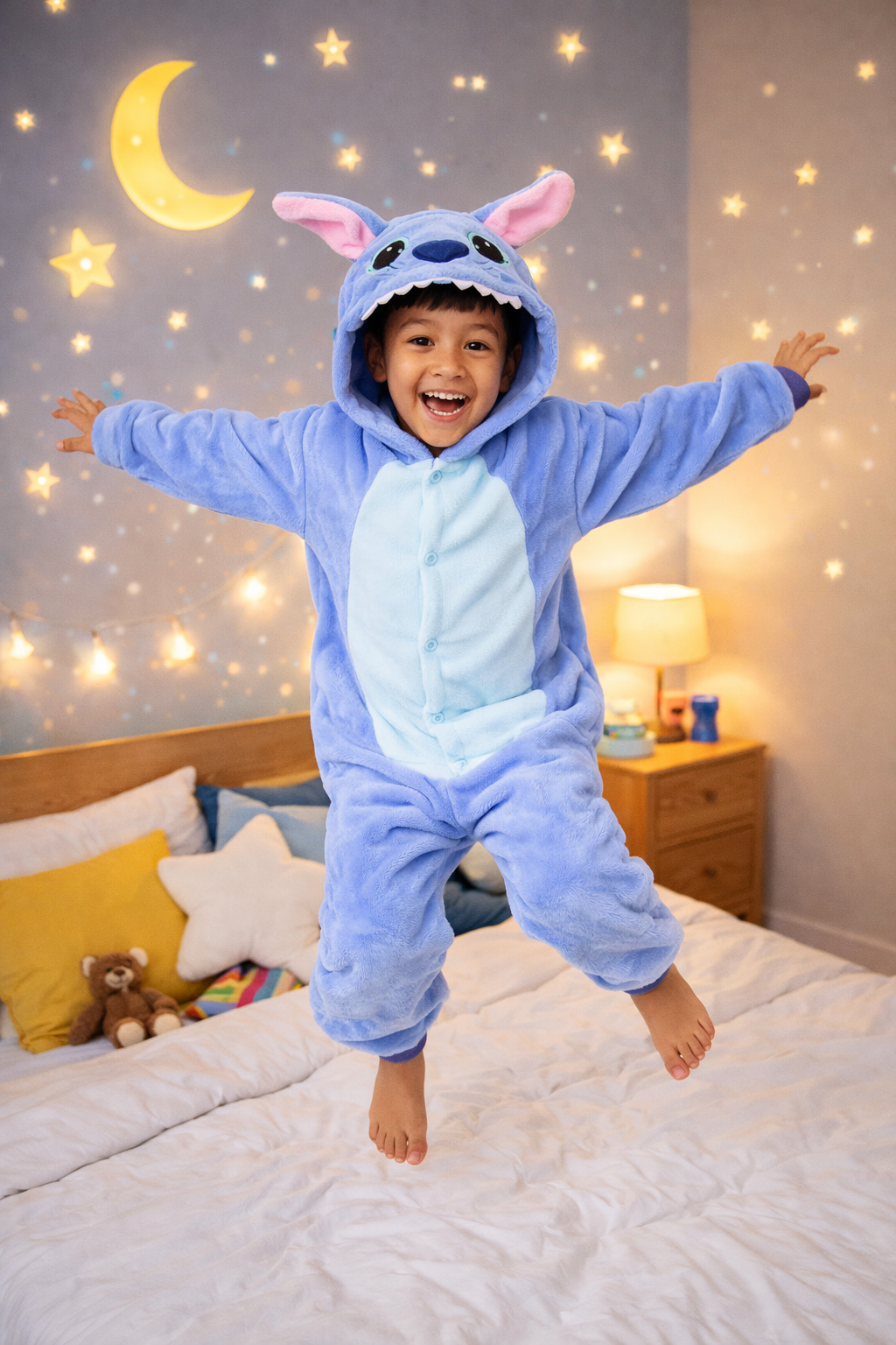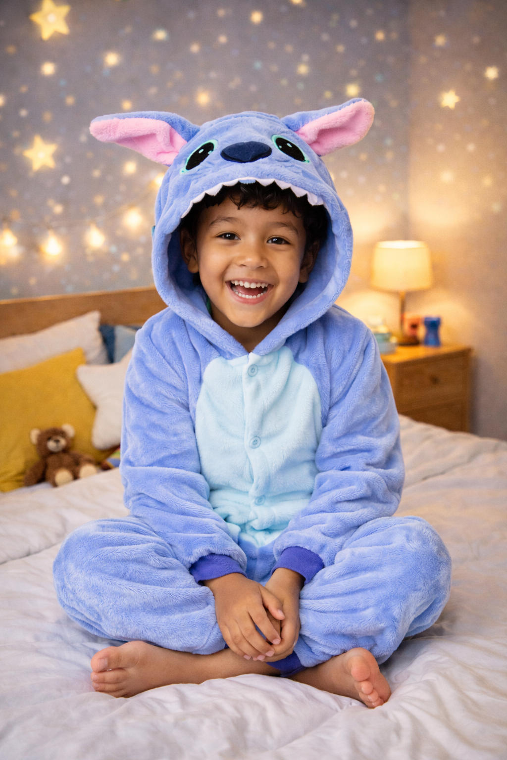 [IMAGEM 1 – GIF: Criança sorrindo vestindo o Kigurumi do Stitch + close mostrando a maciez do material]